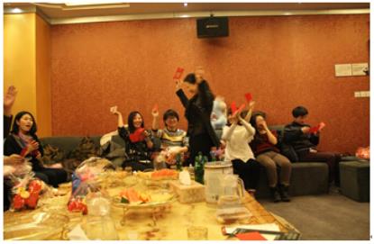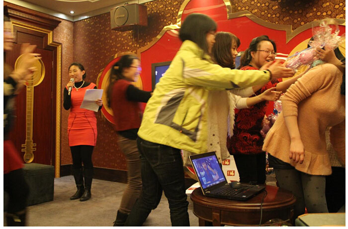 狂歡后,領導們開始派發(fā)新年紅包,內含公司送給大家的新年寄語和春節(jié)福利卡。今晚是個不夜城,大家都滿載而歸,看一個個笑得開心的咧!