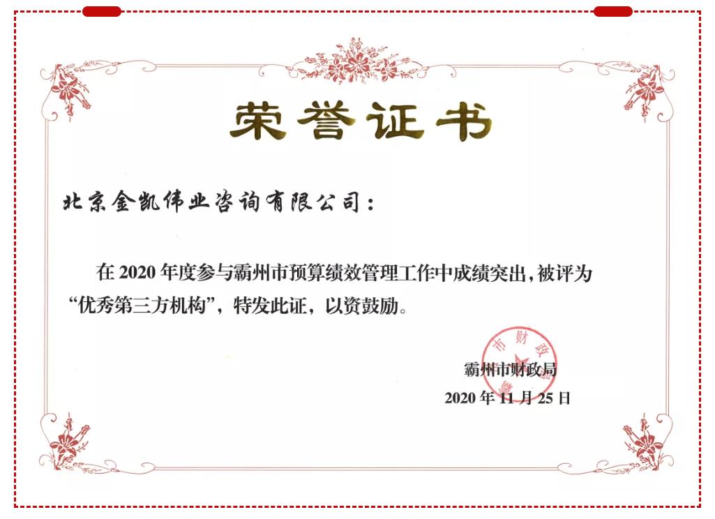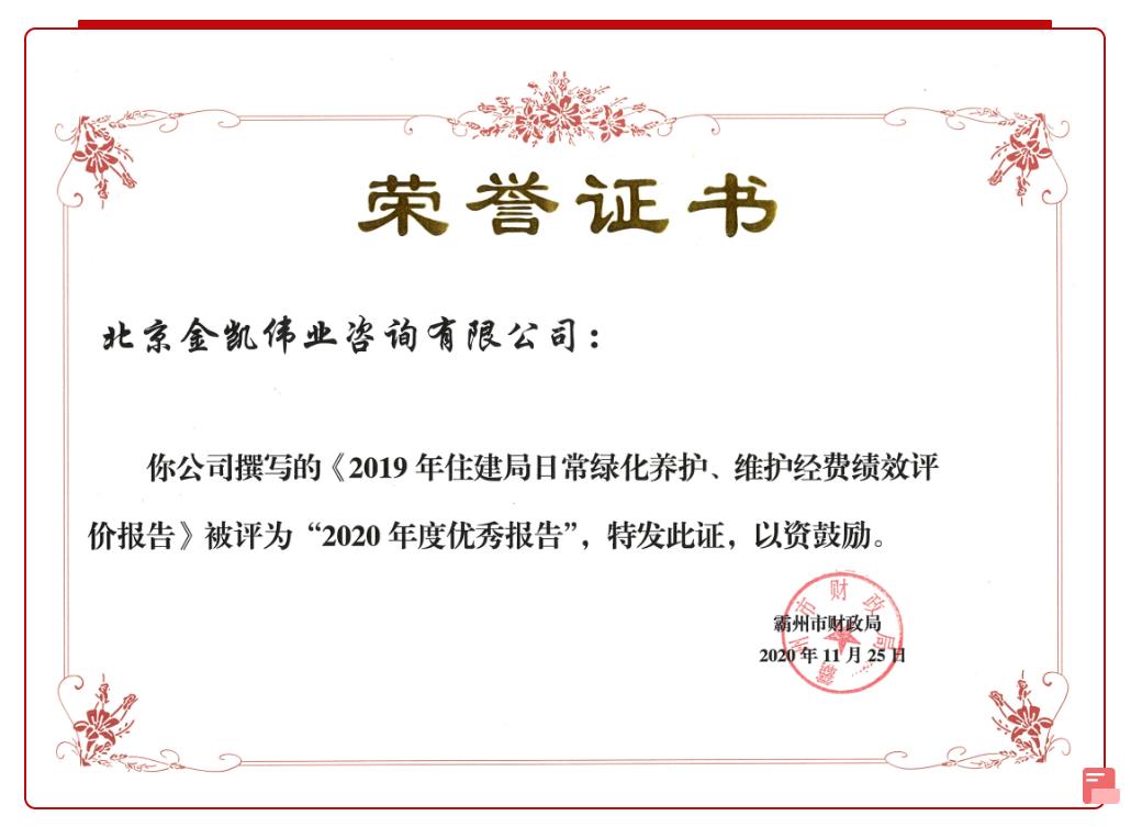 為激勵先進、表彰優(yōu)秀,霸州市財政局于2020年12月7日舉行表彰獎勵儀式,為在本年度預算績效管理工作中表現(xiàn)優(yōu)異的第三方機構(gòu)頒發(fā)榮譽證書。我公司連續(xù)第二年被霸州市財政局評為優(yōu)秀第三方機構(gòu),其中《霸州市市場監(jiān)督管理局部門整體績效評價報告》和《2019年住建局日常綠化養(yǎng)護、維護經(jīng)費績效評價報告》2篇報告被評為優(yōu)秀報告。對霸州市財政局給予的支持和鼓勵我們表示由衷的感謝!