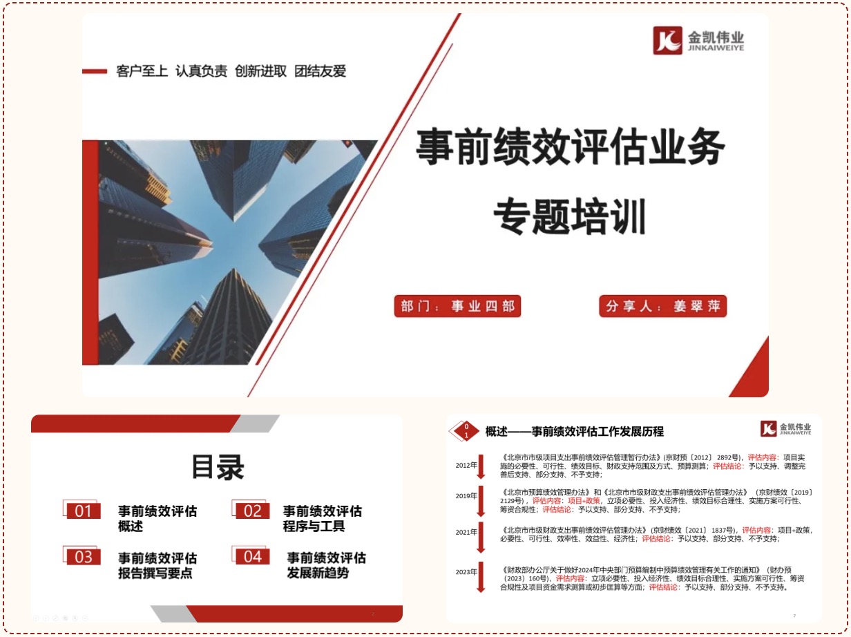 通過專題培訓,我司項目助理系統(tǒng)了解了事前績效評估的相關政策及工作流程,加深了對事前績效評估的理解和認識,進一步掌握了事前績效評估工作操作重點及評估報告撰寫邏輯,提升了其在預算績效管理咨詢工作中有關事前績效評估的實操業(yè)務技能,為今后的工作奠定了良好的基礎。2024年7月,黨的二十屆三中全會審議通過《中共中央關于進一步全面深化改革 推進中國式現(xiàn)代化的決定》,提出“加強公共服務績效管理,強化事前功能評估”,下一步,我司將密切關注有關“事前功能評估”的相關政策及有關舉措,繼續(xù)加強對預算績效管理各環(huán)節(jié)的學習,深入領會和掌握法律法規(guī)要求,全方位提升員工專業(yè)水平及業(yè)務能力,不斷強化我司的服務能力。