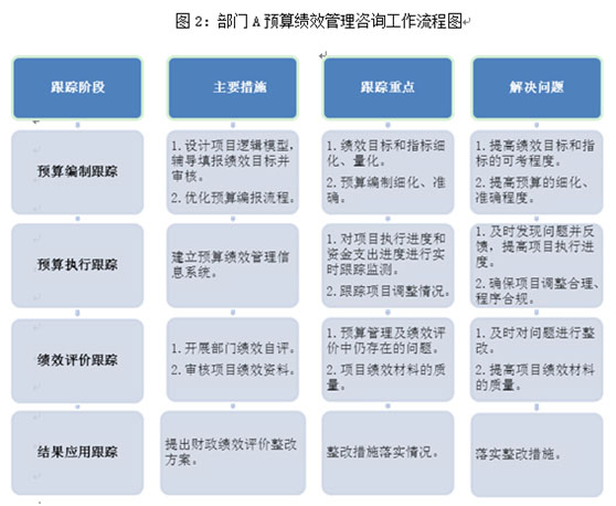 通過協(xié)助部門A落實(shí)預(yù)算績效管理工作,我們對預(yù)算績效管理工作的咨詢模式進(jìn)行了初步探索,下面將工作模式及主要步驟作簡要介紹: