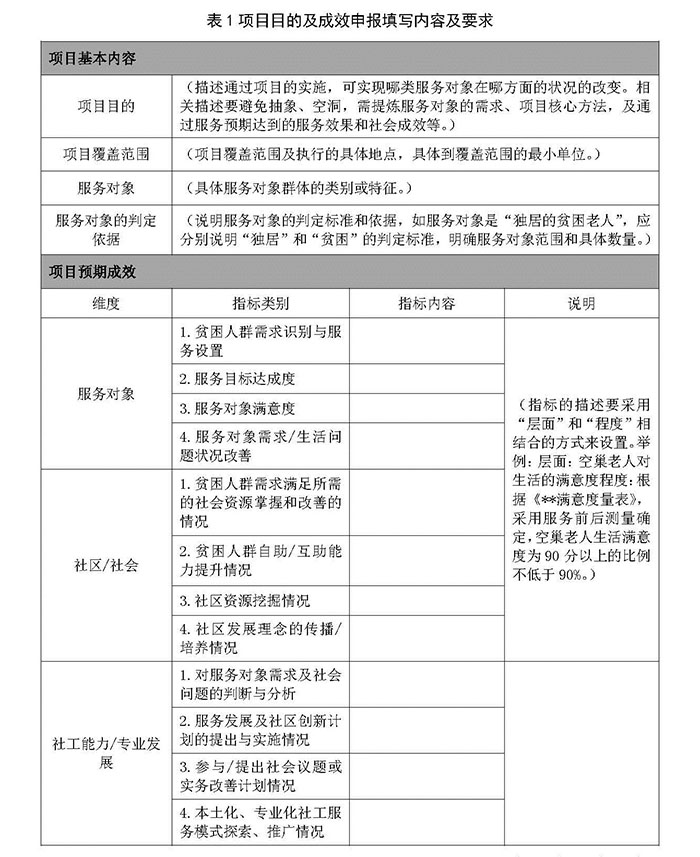 如某省設(shè)立A項(xiàng)目,在全省范圍內(nèi),通過(guò)專業(yè)社會(huì)工作機(jī)構(gòu)、相關(guān)高校研究機(jī)構(gòu)和社會(huì)工作專業(yè)人才培訓(xùn)機(jī)構(gòu)的共同參與,為當(dāng)?shù)刎毨巳禾峁┤诵曰(gè)性化、專業(yè)化社會(huì)工作服務(wù),展示優(yōu)秀社會(huì)工作機(jī)構(gòu)的專業(yè)能力和經(jīng)驗(yàn),建立可供社會(huì)服務(wù)制度化發(fā)展使用的標(biāo)準(zhǔn)與指標(biāo),促進(jìn)當(dāng)?shù)厣鐣?huì)工作隊(duì)伍管理和運(yùn)作的科學(xué)化、規(guī)范化,推動(dòng)完善社會(huì)服務(wù)機(jī)制,強(qiáng)化社會(huì)服務(wù)能力,提升社會(huì)治理水平。以醫(yī)療與精神健康社會(huì)工作服務(wù)、農(nóng)村留守人員社會(huì)工作服務(wù)、困境老人社會(huì)工作服務(wù)領(lǐng)域?yàn)橹攸c(diǎn),扎根20個(gè)社區(qū),支持20個(gè)社會(huì)急需、創(chuàng)新性強(qiáng)、具有一定推廣價(jià)值的社會(huì)工作服務(wù)項(xiàng)目。要求各項(xiàng)目執(zhí)行機(jī)構(gòu)要根據(jù)項(xiàng)目總體實(shí)施方案、項(xiàng)目任務(wù)目標(biāo)及相關(guān)要求,填寫項(xiàng)目申報(bào)材料。申報(bào)材料中,對(duì)項(xiàng)目目的及成效的要求如表1。由表1的設(shè)置可以看出,A項(xiàng)目主管單位(即購(gòu)買主體)在項(xiàng)目申報(bào)材料要求設(shè)計(jì)上下足了功夫,為確保項(xiàng)目申報(bào)單位(即承接主體)的申報(bào)材料滿足相關(guān)要求、項(xiàng)目申報(bào)目標(biāo)與總目標(biāo)保持一致、項(xiàng)目預(yù)期績(jī)效量化、細(xì)化,在前期即制定了詳細(xì)的要求說(shuō)明,為提高申報(bào)材料的規(guī)范性、項(xiàng)目評(píng)審做了充足的準(zhǔn)備。