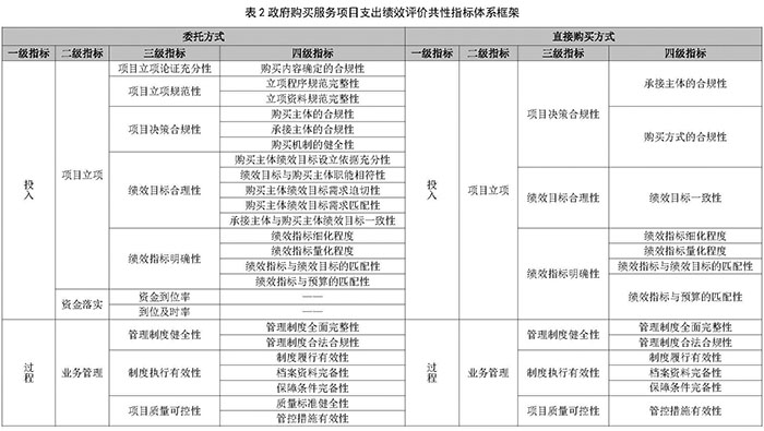 對(duì)購(gòu)買和委托兩種方式購(gòu)買的服務(wù)開展績(jī)效評(píng)價(jià)工作,以下將舉例說(shuō)明。項(xiàng)目B是由殘疾人發(fā)展事業(yè)相關(guān)部門組織立項(xiàng),針對(duì)殘疾人康復(fù)輔具、殘疾人照料服務(wù)、殘疾人就業(yè)培訓(xùn)輔導(dǎo)等方面,在明確項(xiàng)目目的要求的情況下,通過(guò)政府購(gòu)買服務(wù)方式開展并完成項(xiàng)目年度工作任務(wù)。首先,我們要明確兩種政府購(gòu)買方式:第一,如果該項(xiàng)目是由項(xiàng)目立項(xiàng)主管部門負(fù)責(zé)實(shí)施,直接通過(guò)公開招標(biāo)、邀請(qǐng)招標(biāo)、競(jìng)爭(zhēng)性談判、單一來(lái)源等方式確定服務(wù)的承接主體,我們稱此種方式為直接購(gòu)買服務(wù);此外,如果項(xiàng)目立項(xiàng)主管部門在明確項(xiàng)目的目的要求后,由其下屬的省市級(jí)或其他相關(guān)部門按照規(guī)定來(lái)執(zhí)行政府購(gòu)買服務(wù)工作,我們稱之為委托購(gòu)買服務(wù)。在兩種情況下,項(xiàng)目立項(xiàng)主管部門開展績(jī)效評(píng)價(jià)工作的內(nèi)容略有差異。評(píng)價(jià)指標(biāo)框架詳見表2。