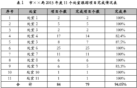 一份“高大上”的評價報告,僅有文字分析或僅有圖表列示是遠遠不夠的,圖表和文字的結(jié)合往往更能讓閱讀報告的人對報告所要闡述的內(nèi)容印象深刻,如市××局2013年度自評報告初稿中產(chǎn)出數(shù)量指標分析中僅用表列示了市××局2013年度11個處室跟蹤項目完成情況,并未對表中數(shù)據(jù)和數(shù)據(jù)背后的原因進行較為詳細的闡述,使該部分內(nèi)容看起來單一。修改后為: