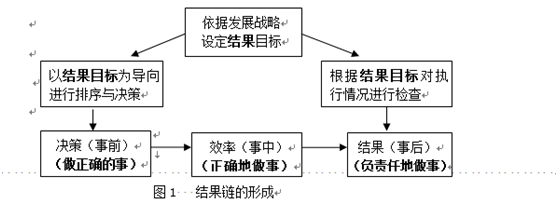 由此,結(jié)果導(dǎo)向改變了傳統(tǒng)意義上績效管理單純注重經(jīng)濟(jì)成果的格局,而將決策、效率與運(yùn)營責(zé)任一并納入考核范圍,使績效管理更加全面、更加完整,也更加科學(xué)。結(jié)果導(dǎo)向也據(jù)此形成一個(gè)完整的以結(jié)果為核心的鏈條,并將其貫穿于管理活動(dòng)的全過程(圖1)。