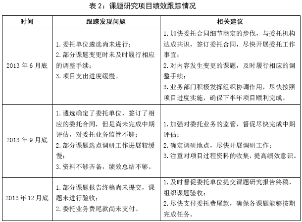 2013年,定期對(duì)重點(diǎn)項(xiàng)目執(zhí)行情況進(jìn)行了過程跟蹤,要求相關(guān)處室及時(shí)填報(bào)《績效跟蹤分析表》,準(zhǔn)備項(xiàng)目相關(guān)資料,從項(xiàng)目初始績效目標(biāo)、項(xiàng)目調(diào)整情況、績效目標(biāo)調(diào)整情況、項(xiàng)目資金到位情況、項(xiàng)目財(cái)務(wù)管理情況、制度建設(shè)及執(zhí)行情況、組織機(jī)構(gòu)情況、項(xiàng)目進(jìn)度情況、階段性完成情況等9個(gè)方面對(duì)項(xiàng)目實(shí)施情況進(jìn)行績效跟蹤,了解各項(xiàng)目預(yù)算執(zhí)行及完成情況。課題研究項(xiàng)目具體跟蹤情況見表2。