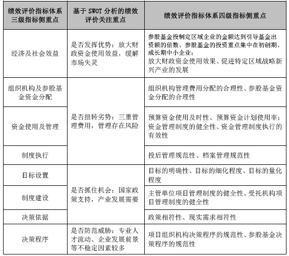 。2)結(jié)合基于政府引導(dǎo)基金SWOT分析的績效評價(jià)關(guān)注重點(diǎn),細(xì)化績效評價(jià)指標(biāo)體系的四級指標(biāo)